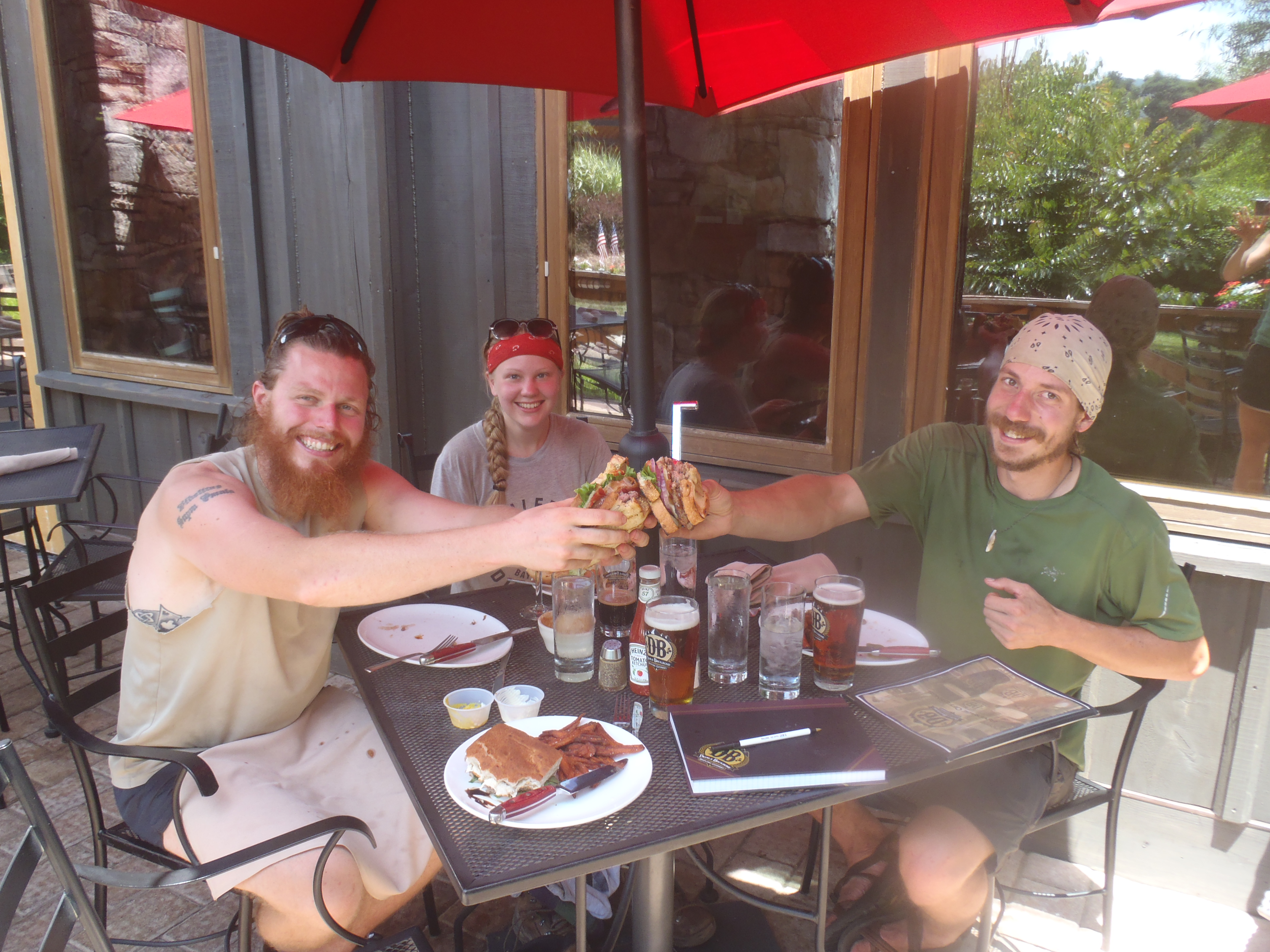 A few days after Cold Mountain our friend “Fern Gully” had a birthday that just so happened to coincide with the day we passed a road intersection only 6 miles from The Devil’s Backbone brewery. Well, we aren’t one to fight destiny so if you walk near a brewery on someone’s birthday you get your thumb out and go down the hill for a few beers! We hit the side of the road and the girls did their best, and despite the non-hiker friendly hitching conditions the six of us were drinking beer in an hour. “Bullfrog”, “Turtle”, “Chubby Bunny”, “Fern Gully” and us, “The Fat Kids” spent the afternoon enjoying some good beers, a birthday shot or two and possibly the best burger I’ve ever had. Being dehydrated and not drinking frequently doesn’t help the alcohol tolerance but hey, at least we were all pretty cheap drunks. Getting back to the trail turned out to be an adventure in itself, packing 6 semi-drunk hikers with all their gear and a very uncomfortable puppy into the back of a 20 year Chevy S10 is a trail memory I won’t soon forget.